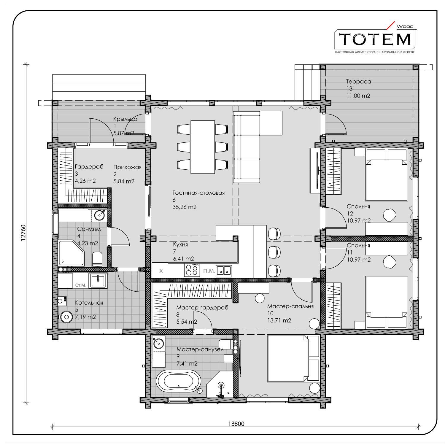 Общая площадь: 130 м² Этажность: 1 этаж Габариты: 12.76 × 13.8 м